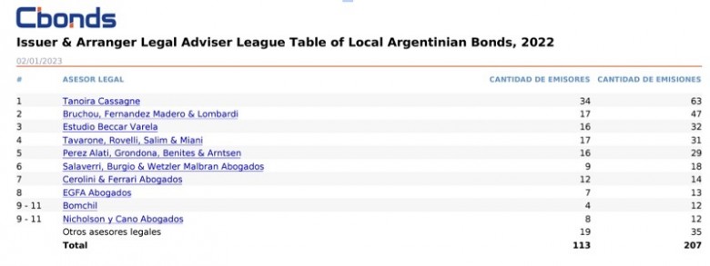 En su último relevamiento sobre las firmas de abogados en la República Argentina que asesoraron a emisores y colocadores en emisiones de bonos durante el año 2022, Cbonds reveló que TCA Tanoira Cassagne fue la firma argentina líder, tanto por cantidad de emisores (34 emisores), como por cantidad de emisiones (63 emisiones).