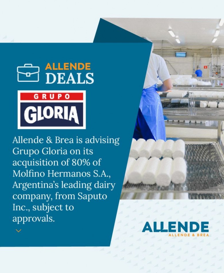 Allende & Brea asesora a Gloria Foods en la adquisición del 80% de la participación accionaria en Molfino Hermanos S.A., la división láctea en Argentina de Saputo Inc. Molfino es el principal procesador de productos lácteos en Argentina. La transacción incluye dos plantas industriales ubicadas en las provincias de Córdoba y Santa Fe, así como marcas locales, entre ellas La Paulina, Ricrem y Molfino. El cierre de la transacción está sujeto a la obtención de las aprobaciones gubernamentales correspondientes y al cumplimiento de otras condiciones habituales de cierre.