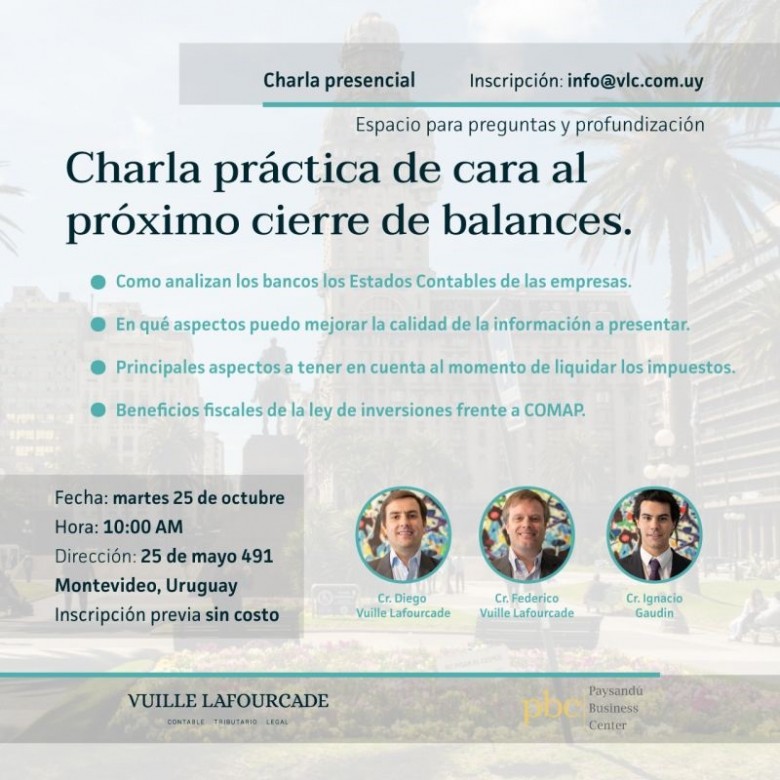 El próximo martes 25 de octubre la firma uruguaya Vuille Lafourcade brindará una charla de carácter informativo, pensada para directores y representantes de empresas sobre el próximo cierre de balances, en el cual introduciremos aspectos prácticos a tener en cuenta a la hora de presentarlos.