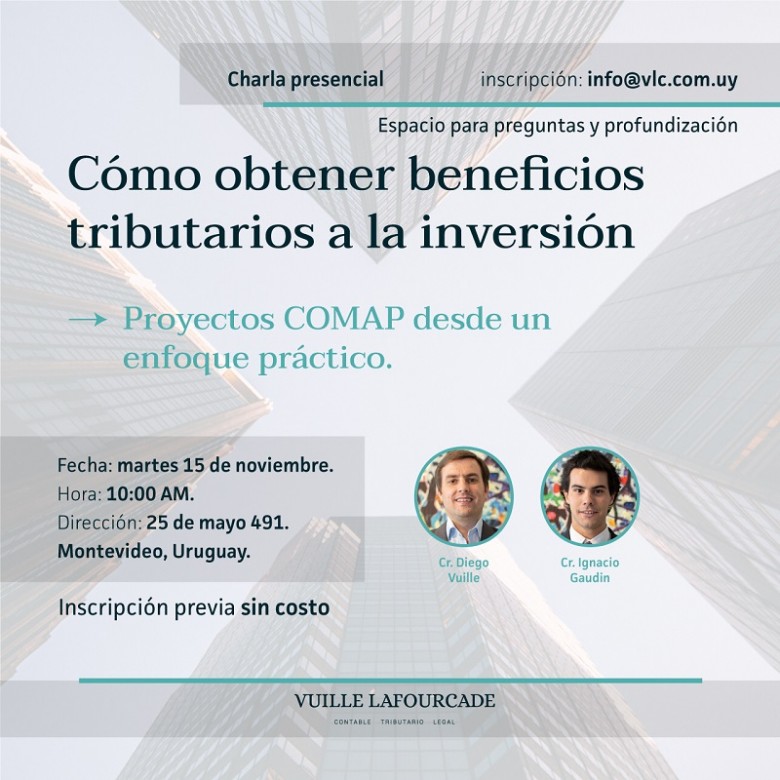 El próximo martes 15 de noviembre en el horario de la mañana – 10:00, y en la sede ubicada en 25 de mayo 491, Montevideo se realizará una charla presencial en donde lo oradores serán el socio y Cr. Diego Vuille y el Cr. Ignacio Gaudín.