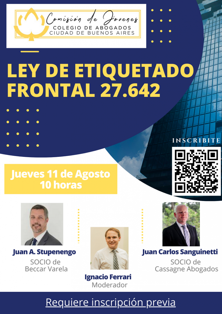 Allí se comentarán las principales implicancias legales y prácticas del nuevo régimen de etiquetado, a cargo de dos profesionales con amplia trayectoria en cuestiones regulatorias de alimentos y bebidas: Juan A. Stupenengo —socio de Beccar Varela— y Juan Carlos Sanguinetti —socio de Cassagne Abogados—.