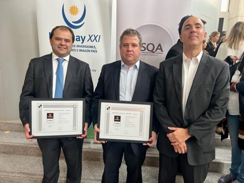 Agustin Mayer West, socio director de Ferrere y Leonardo Isoardi, socio director de CPA Ferrere, recibieron la certificación de la firma, en un evento que contó con la participación ministro de Turismo, Tabare Viera Duarte; la directora general para Asuntos Económicos Internacionales de Cancillería, Ana Ines Rocanova; el director ejecutivo de Uruguay XXI, Sebastian Risso Clerc, el asesor de Presidencia de la República, Diego Silva, y diversos actores del sector privado.