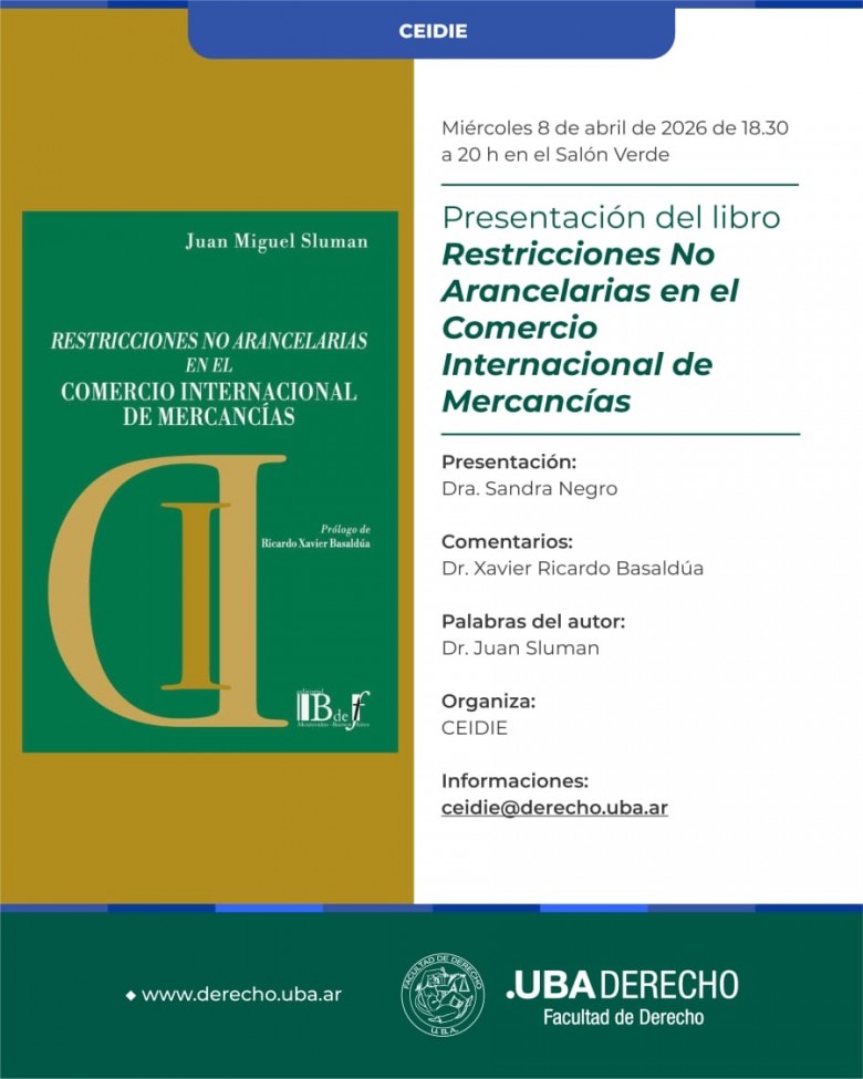 El Centro de Estudios Interdisciplinarios de Derecho Industrial y Económico de la Universidad de Buenos Aires invita a la presentación del libro “Restricciones no arancelarias en el comercio internacional de mercancías”, de Juan Sluman.