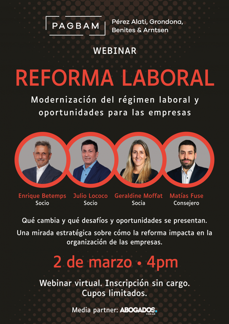 Pérez Alati, Grondona, Benites & Arntsen (PAGBAM) llevará a cabo el webinar “Reforma Laboral 2026: Modernización del régimen laboral y oportunidades para las empresas”, en el que analizará los principales cambios introducidos por la reciente reforma y su impacto en la gestión empresaria.