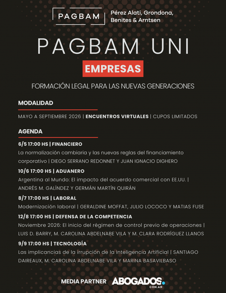 Pérez Alati, Grondona, Benites & Arntsen (PAGBAM) anunció el lanzamiento de una nueva edición de PAGBAM UNI Empresas, su programa de formación legal orientado a las nuevas generaciones, que se desarrollará entre mayo y septiembre de 2026 bajo modalidad virtual.
