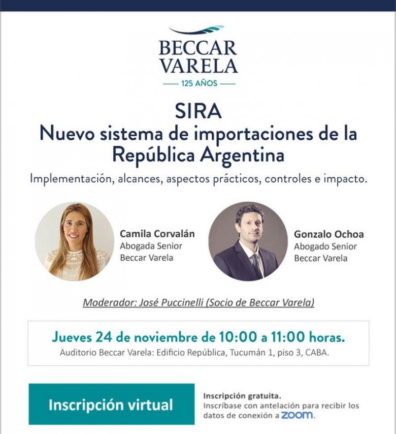 La firma Beccar Varela organizará una charla sobre SIRA, el nuevo sistema de importaciones de la República Argentina. Se tratará su implementación, alcances, aspectos prácticos, controles e impacto.