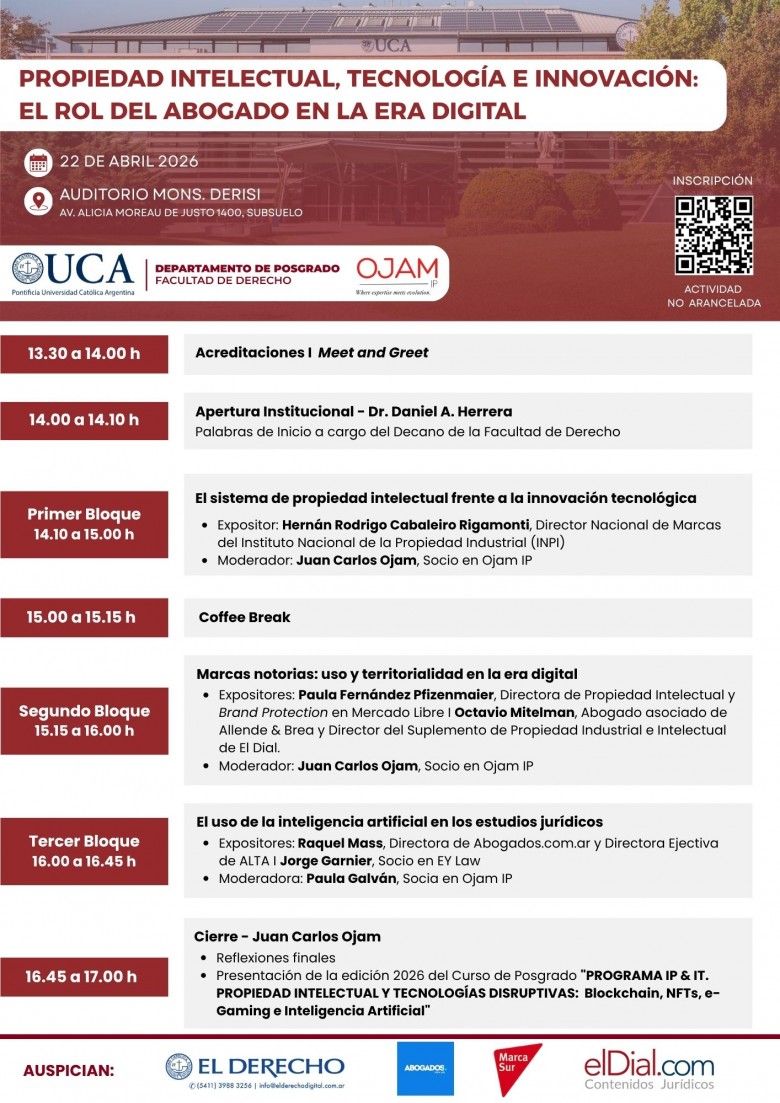 El próximo 22 de abril de 2026, la Facultad de Derecho de la Universidad Católica Argentina (UCA) y Ojam IP realizarán la Jornada Académica “Propiedad Intelectual, Tecnología e Innovación: el rol del abogado en la era digital”, en el Auditorio Mons. Derisi (Av. Alicia Moreau de Justo 1400, Subsuelo, CABA), a partir de las 13:30 hs.