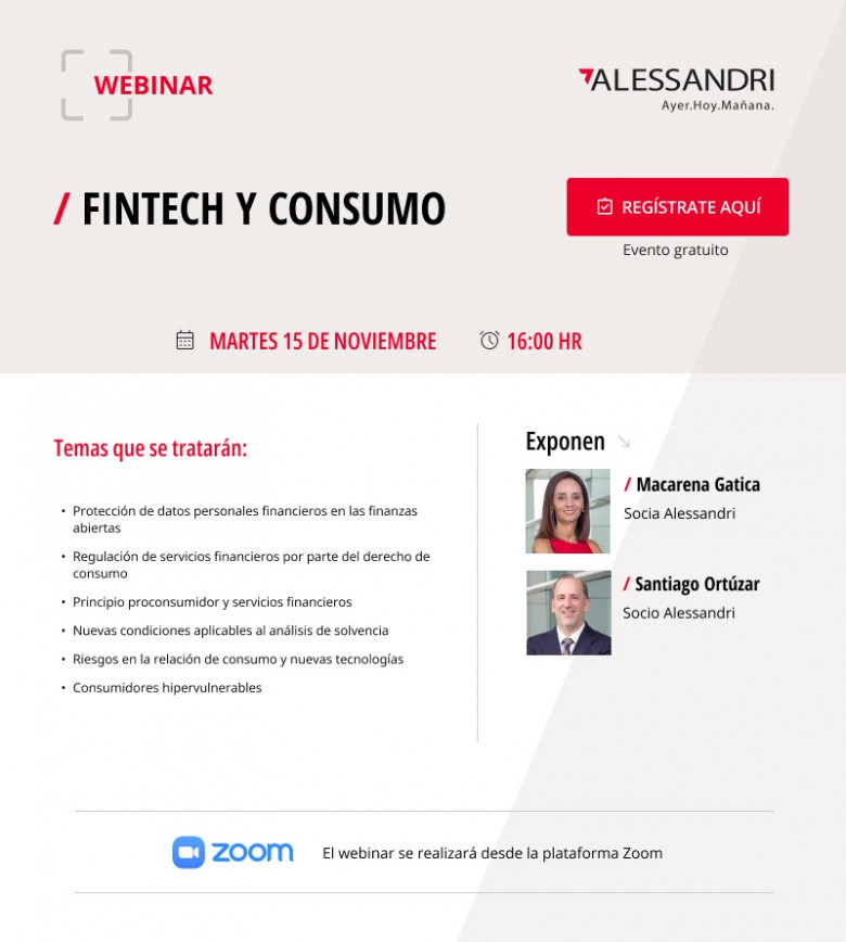 El próximo martes 15 de noviembre, la firma chilena Alessandri organizará un webinar gratuito sobre Fintech y Consumo.